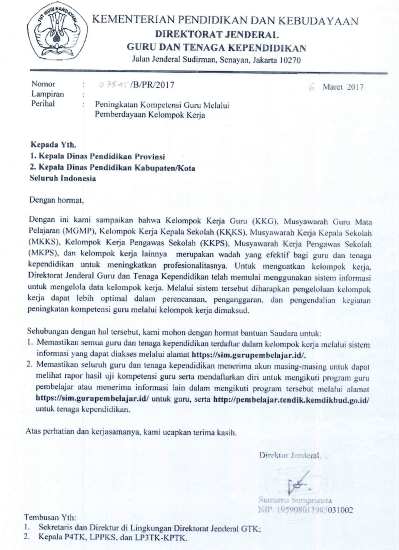 Berikut salinan Surat Edaran Direktorat Jenderal Guru & Tenaga Kependidikan (Dirjen GTK) Nomor : 07545/B/PR/2017 tanggal 6 Maret 2017 yang admin download dari laman dispendik.surabaya.go.id